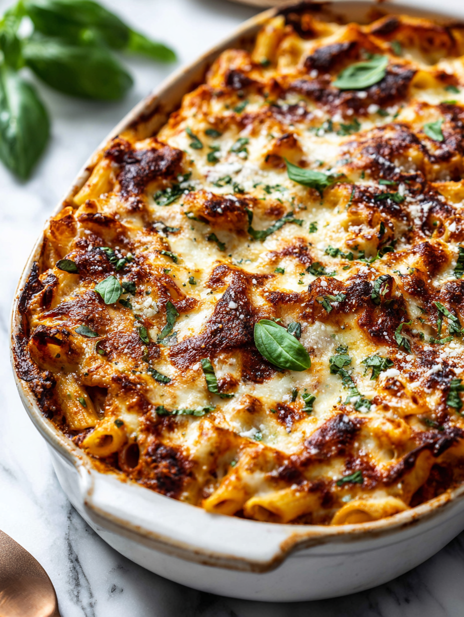 Allow the baked ziti to rest for 5 minutes after removing from the oven. This helps the layers set, making it easier to serve clean slices. Garnish with fresh basil or herbs if you like, then scoop onto plates, ensuring some crispy edges make it to each serving.