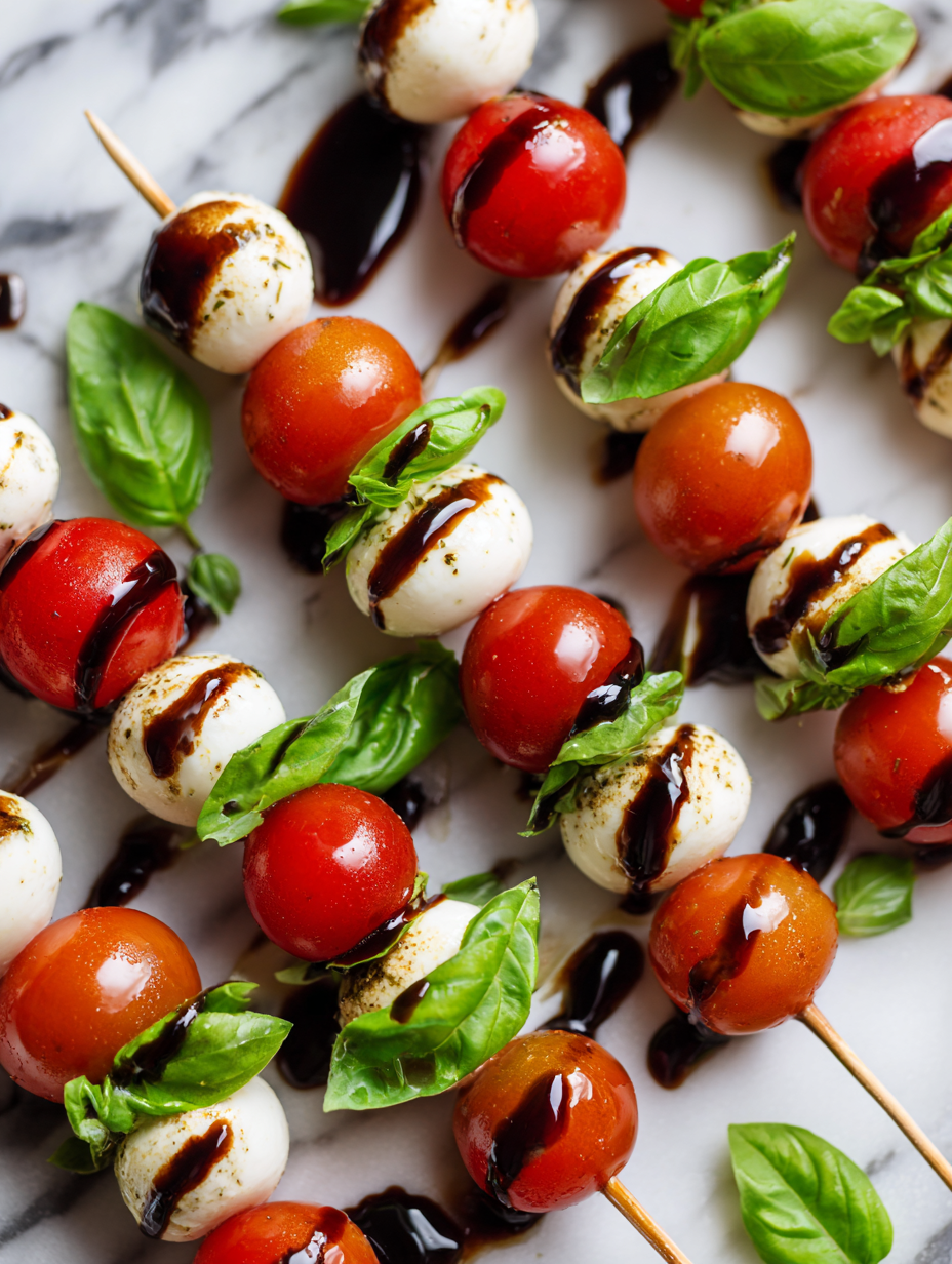 - Drizzle the balsamic glaze over the assembled skewers, letting it pool slightly for a glossy finish.