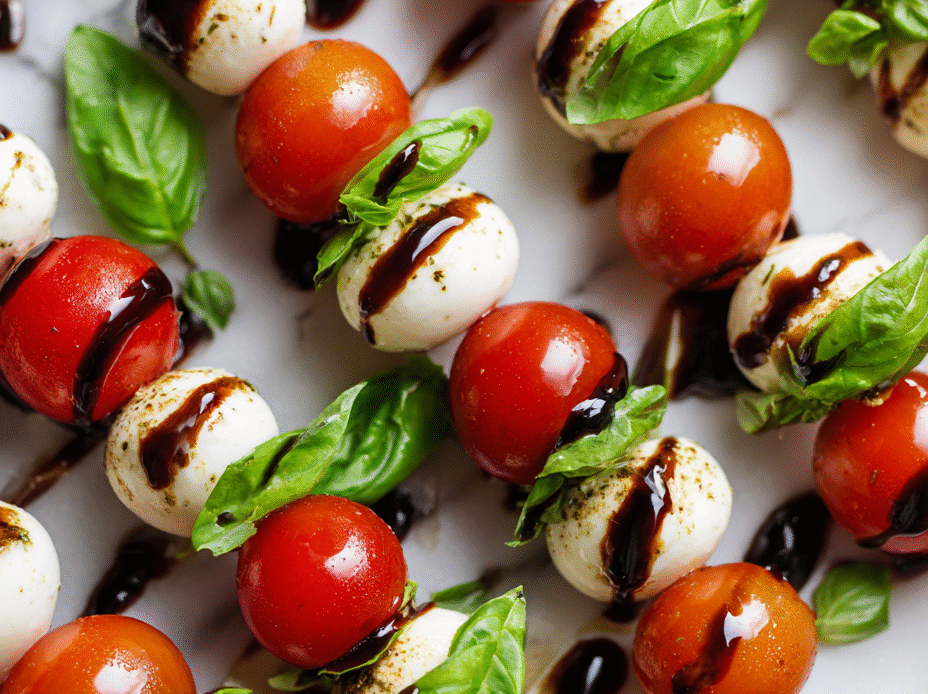 - Drizzle the balsamic glaze over the assembled skewers, letting it pool slightly for a glossy finish.