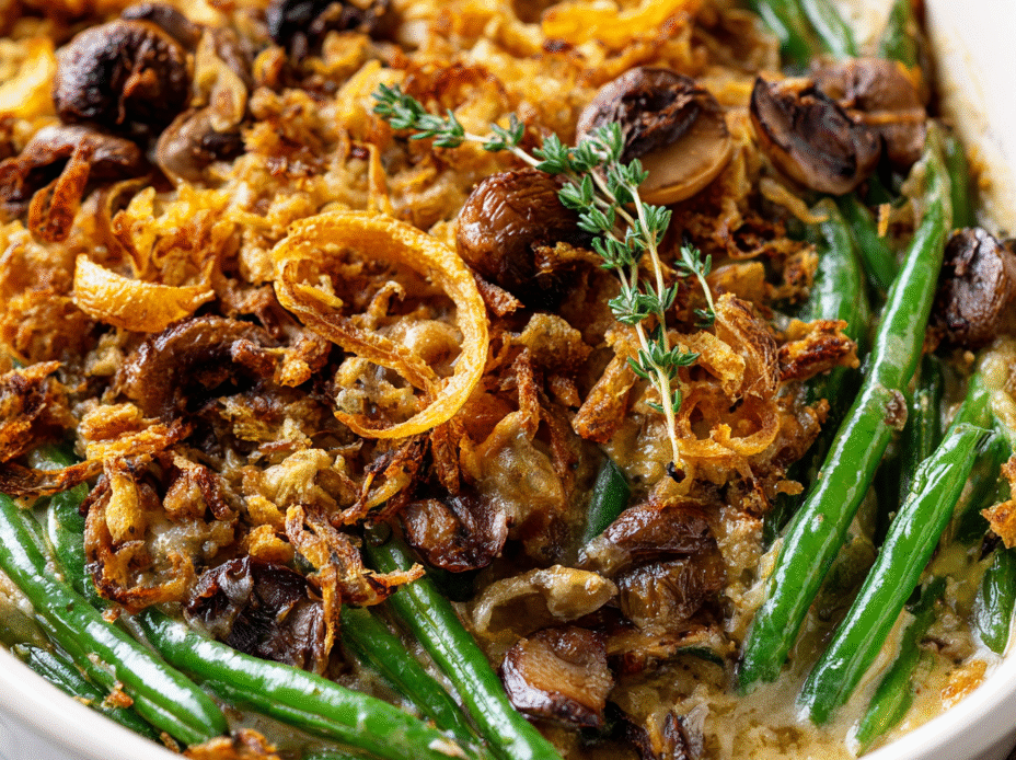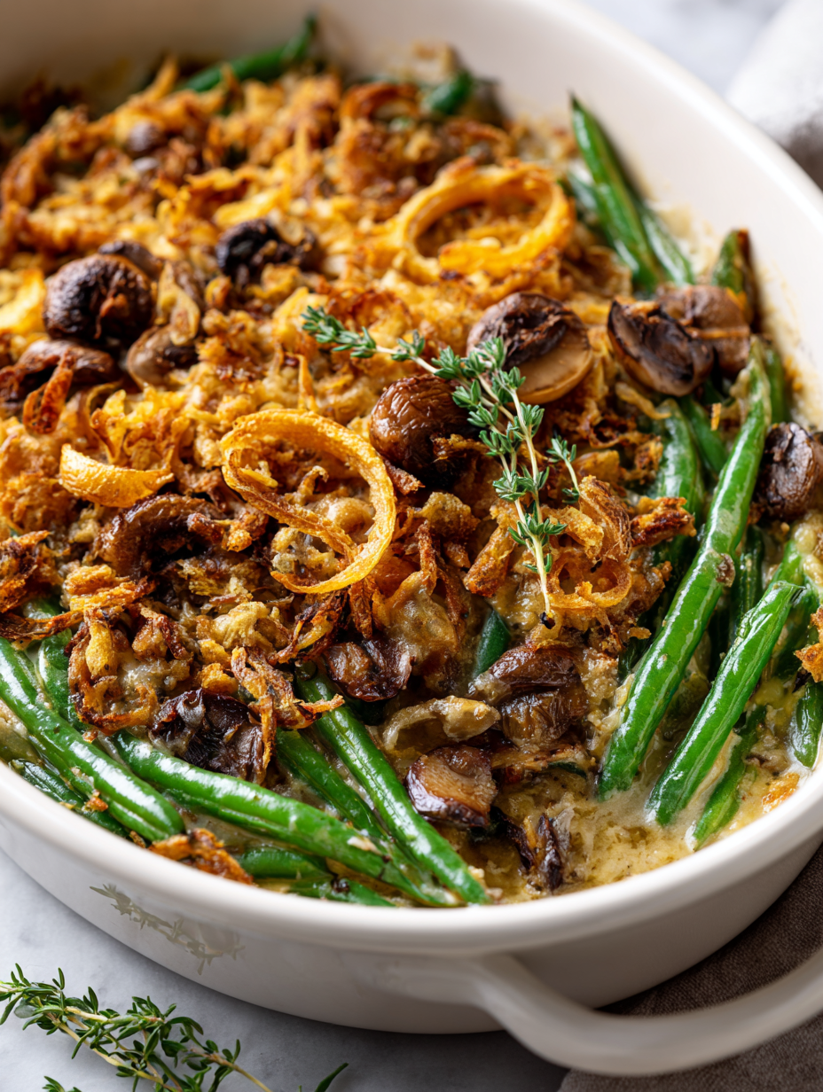 - Serve hot, with the crispy onions still crackling, and enjoy the comforting aroma of baked green beans and rich mushroom sauce.