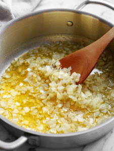 - Heat the large stockpot over medium heat and add a splash of oil. Sauté diced onions until they become translucent and fragrant, about 5 minutes.