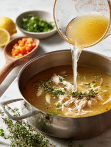 Step 4: Pour in chicken broth, about 8 cups, and bring to a gentle simmer. Add shredded cooked chicken, herbs, and seasonings.