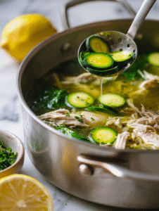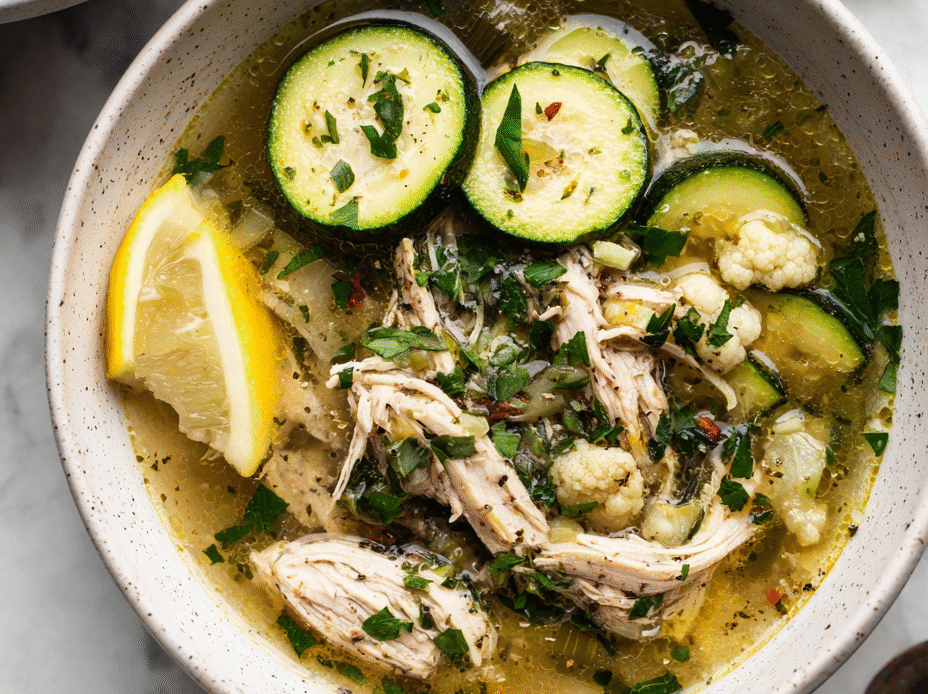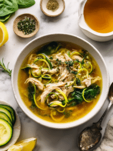 This keto chicken soup combines tender diced chicken breasts and fresh vegetables simmered in rich chicken broth, resulting in a hearty yet light dish. The soup features zucchini, spinach, and fragrant herbs, finished with a squeeze of lemon for brightness, offering a comforting, vibrant bowl with a smooth, brothy texture.