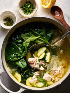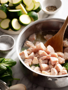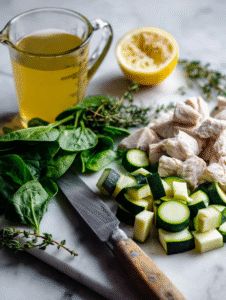 1. Gather all your ingredients: diced chicken, sliced zucchini, fresh spinach, herbs, lemon, and broth.