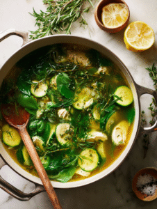 11. Serve the soup hot, garnished with additional herbs if desired, and enjoy the vibrant, nourishing broth with tender chicken and vegetables.