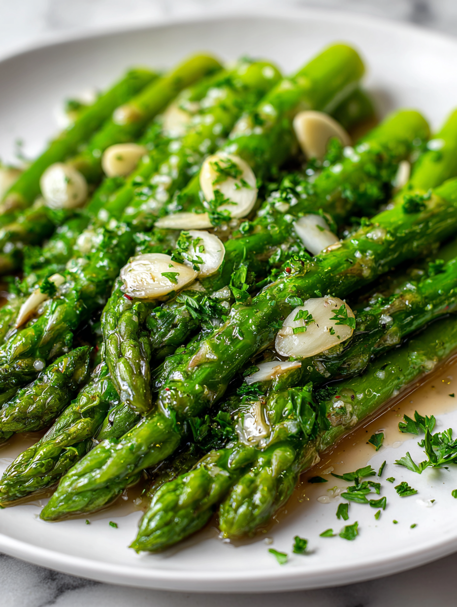 - Serve immediately while warm, enjoying the vibrant color, fragrant aroma, and tender-crisp texture of the asparagus coated in garlic butter.