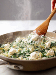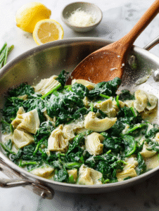 Step 3: Add chopped spinach and cook until wilted, about 2 minutes. Stir in chopped artichoke hearts and cook for another minute.