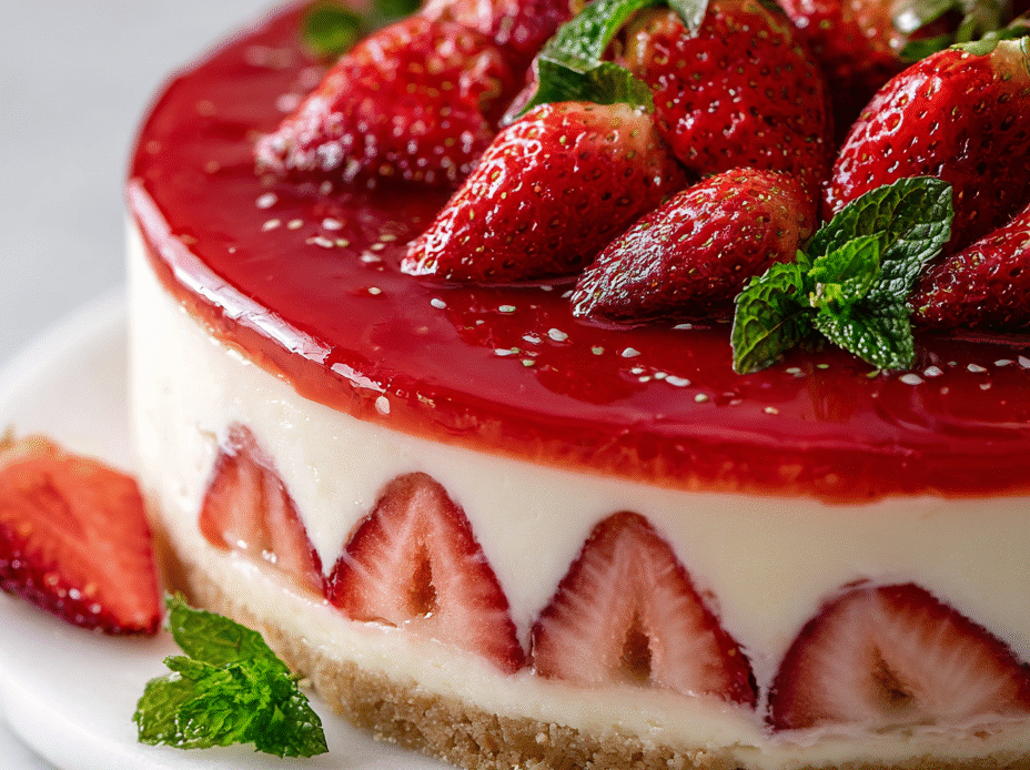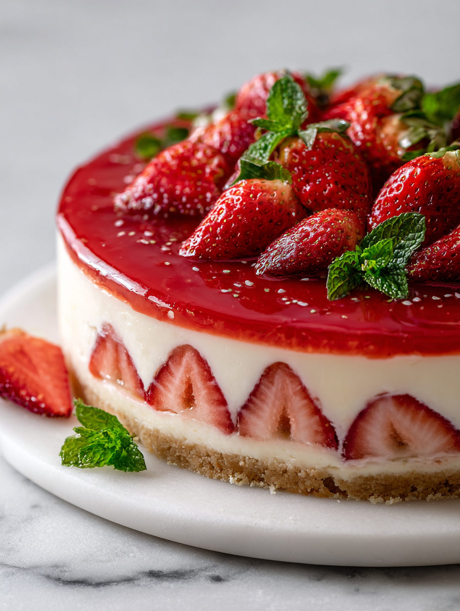- Finish and serve: Gently remove the sides of the springform pan. Slice with a sharp knife, wiping between cuts for clean edges. Serve chilled, with extra strawberries and whipped cream if you like.