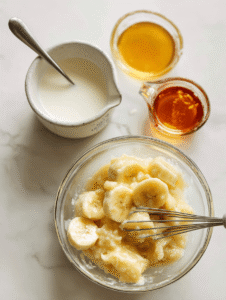 - Mash the bananas thoroughly until smooth and no lumps remain, then stir in the plant-based milk, maple syrup, vinegar, and oil. Whisk until the mixture is creamy and slightly frothy.