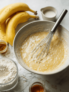 - Blend wet ingredients: Mash bananas, then stir in plant milk, maple syrup, vinegar, and oil. Make sure the bananas are fully incorporated—no lumps!
