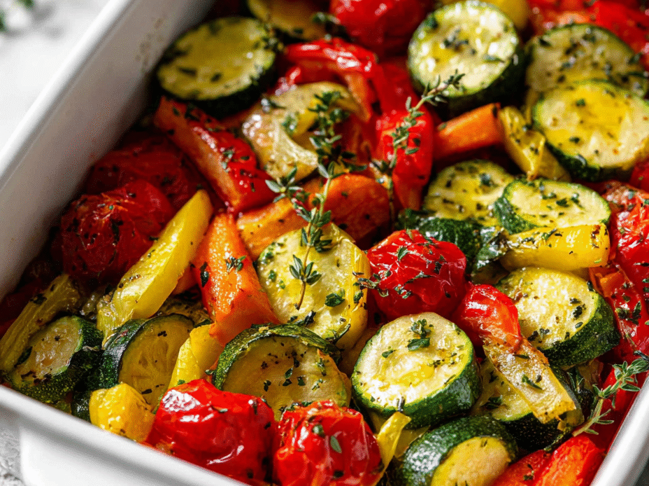 3. Toss vegetables with olive oil, salt, pepper, and your chosen herbs. Spread evenly in a 9×13 inch baking dish.